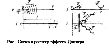 Движение наблюдателя относительно источника. Пусть наблюдатель Н движется относительно источника И со скоростью u (рис. б). Рассуждая аналогично предыдущему случаю, можно показать, что частота, воспринимаемая наблюдателем, равна