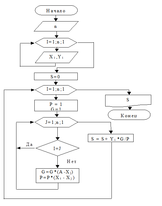 Это алгебраический многочлен n-й степени, удовлетворяющий всем табличным значениям функции, т.е. если в эту формулу подставить значение x = a, то получим значение j (a) = f (a), алгоритм нахождения интерполяционного многочлена представлен на рис. 2.4.