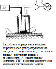 Ультразвук позволяет дифференцировать мягкие ткани,, различающиеся по плотности всего на 0,1%- Кроме того, ультразвук низких интенсивностей практически безвреден, а ультразвуковая аппаратура компактнее и дешевле рентгеновской. Принцип ультразвукового эхо-метода пояснен на рисунке. Ультразвуковой генератор (УЗГ) создает электрические импульсы ультразвуковой частоты, поступающие на пьезокристалл, от которого в тканях распространяется УЗ волна. Если волна встречает на своем пути участок, акустическое сопротивление которого иное, чем у окружающей среды (например, на границе между жировым слоем и мышечной тканью), то она отражается и попадает на приемник ультразвука, в котором возбуждает электрические колебания. Эти колебания затем направляются в усилитель и на регистрирующее устройство, например на электронный осциллограф, на экране которого возникает сигнал, позволяющий судить о размерах, форме и глубине залегания отражающего объекта.