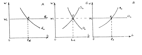 На крайнем справа графике В показано, что отдельный работник также должен принимать эту ставку зарплаты. Он сталкивается с абсолютно эластичным спросом на свой труд (D L) со стороны всех нанимателей. Иначе говоря, если он согласится на такую ставку зарплаты, то при желании и возможности, он сможет предложить сколь угодно много часов труда. Если же он потребует хоть чуть-чуть более высокую ставку, то он просто останется без работы (никто не наймет его по ставке выше W c). При данной индивидуальной кривой предложения своего труда (s L) он «поставит» на рынок l s часов труда.
