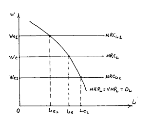 Независимо от того, какая будет ставка зарплаты, спрос на труд со стороны фирмы определяется относительно точки пересечения W и MRР L. Если ставка зарплаты возрастает до W e1, то спрос на труд сокращается до L e1, если ставка зарплаты снижается до W e2, то, напротив, спрос на труд увеличивается до L e2. Таким образом, кривая MRР L показывает количество труда, которое фирма нанимает при каждой данной ставке зарплаты. Значит, она и есть кривая спроса на труд фирмы.