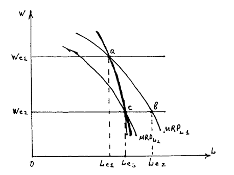 Однако проблема состоит в том, что падение ставки зарплаты затрагивает всех нанимателей. Они все захотят нанять больше труда. Когда же они сделают это, то общий выпуск отрасли увеличится, а следовательно Р (MR) снизится. Это сдвинет кривую MRР Lфирмы влево в положение MRР L2 и ее спрос на труд определится относительно точки с и составит величину равную L e3 (при этом очевидно, что L e3< L e2). Следовательно, когда учтено влияние более низкой ставки зарплаты на рыночную цену блага, то кривая спроса отдельной фирмы на труд будет представлена линией, соединяющей точки а и с (жирная линия на рис. 7.7).