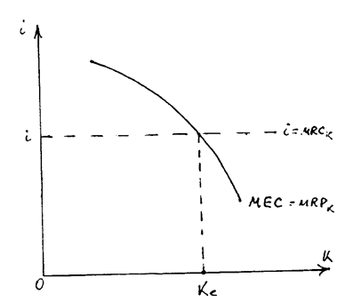 Максимизирующее прибыль решение фирмы представлено на рис. 7.17. По мере наращивания инвестиций растет запас капитала, так что MEC сокращается в соответствии с законом убывающей отдачи. Пока MEC > i, то фирма должна продолжать инвестировать в таком объеме, чтобы наращивать имеющийся у нее запас капитала. Она прекратит инвестиции в объеме, позволяющем наращивать запас капитала тогда, когда последний достигнет величины K e. Затем, инвестиции будут сокращены до уровня, достаточного только для замены изношенного капитала, и, таким образом, фирма будет постоянно поддерживать запас своего капитала на уровне K e.