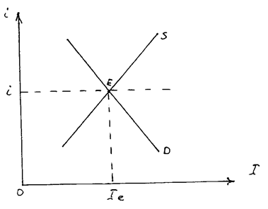 Равновесие спроса и предложения на рынке заемных средств достигается, как и на всех прочих рынках, при равенстве спроса и предложения. Устанавливается равновесная процентная ставка (i e) и ей соответствует равновесное количество заемных средств I e.