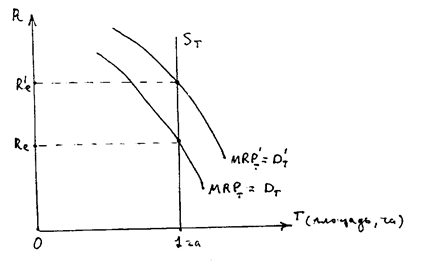 Для чистоты анализа представим себе землю, которая готова к использованию в производственном процессе без какого-либо предварительного человеческого воздействия на нее. Если ее количество фиксировано (например, 1 га), то кривая ее предложения будет вертикальной линией (S T нарис. 7.19). Кривая спроса на землю подобна кривым спросам на прочие ресурсы. Она представляет MRP и имеет отрицательный наклон в силу убывающей отдачи с земли. Равновесная рента (R e) определяется пересечением кривых спроса и предложения.