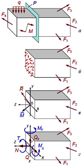 3. З аменить действие отброшенной части внутренними усилиями. Систему внутренних сил можно привести к главному вектору` R и главному моменту ` М. За точку приведения обычно принимают центр тяжести сечения 0 (рис. 1.3, в) Выбрав систему координат х, у, z (z – продольная ось по нормали к поперечному сечению, x и y – в плоскости этого сечения) и начало системы в центре тяжести, обозначим проекцию главного вектора R на координатные оси через N, Qx, Qy, а проекции главного момента ` М – Мх, Му, Мz.