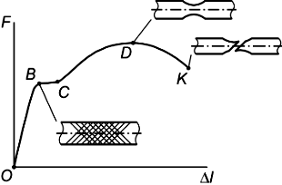 В процессе растяжения, реализуемого на специальных испытательных машинах, автоматически записывается диаграмма испытания в координатах сила – удлинение. Для малоуглеродистой стали эта диаграмма выглядит следующим образом: