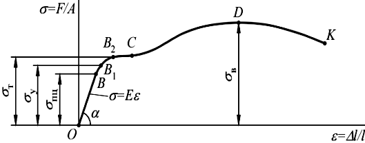 OB – участок упругости. После нагружения в пределах этого участка образец возвращается в исходное состояние. Такая деформация, полностью исчезающая после разгрузки, называется упругой.