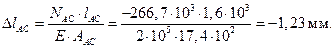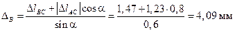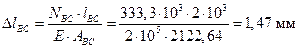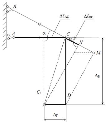 План перемещения представлен на рис.2.9. Для определения перемещения узла С положим, что стержни в узле С не соединены между собой. Тогда стержень ВС удлинится на величину Dl ВС, и стержень АС укоротится на величину Dl АС. Новое положение узла С (точка С 1) определится как точка пересечения перпендикуляров к стержням ВС и АС, проведенных из конца стержней ВС +Dl ВС и АС -Dl АС (вместо дуг радиусов ВС +Dl ВС и АС -Dl АС). Из схемы видно, что горизонтальное перемещение точки С равно DГ=|Dl АС |=1,23 мм. Для нахождения второй координаты точки С 1 - D В проведем из точки D перпендикуляр на продолжение стержня ВС. Тогда удлинение Dl ВС можно представить как разность отрезков