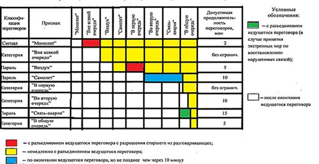 Для телефонной связи: пароли – «Монолит», «Воздух», «Самолёт», «Связь-авария»; категории – «Вне всякой очереди», «В первую очередь», «Во вторую очередь», «В общую очередь».