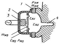 В качестве электроакустических преобразователей, превращающих электрические колебания в звуковые, акустические колебания воздушной среды (т.е. акустические волны), используют громкоговорители и телефоны. В настоящее время наиболее распространены электродинамические громкоговорители непосредственного излучения (диффузорные). Однако в абонентских устройствах СПРС они находят ограниченное применение. В отличие от громкоговорителя задачей телефона является не излучение акустической энергии в окружающее воздушное пространство, а подведение ее непосредственно к уху. Это определяет конструкцию головного телефона, который состоит из электроакустического преобразователя, капсюля, корпуса, а также эластичной раковины, являющейся элементом, связывающим его с ухом (рис. 5.3). Здесь: 1 – раковина, 2 – капсуль, 3 – преобразователь, 4 – канал уха.