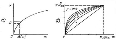 Рис. 7.5. Принцип нелинейного квантования (а) и характеристики компрессии по m - закону (б)
