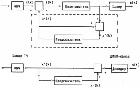 В обычной системе с ИКМ каждый отсчет входного сигнала кодируется независимо от всех остальных. В то же время анализ показывает, что речевой сигнал (РС) характеризуется сильной автокорреляцией - коэффициент корреляции (мера предсказуемости) между соседними отсчетами, следующими с частотой 8 кГц, составляет в общем случае 0,85 или больше. Это означает, что две соседних выборки не могут сильно отличаться друг от друга. Соответственно, если кодировать только разность между ними, то можно снизить скорость передачи двоичных данных, представляющих речевой сигнал. Более того, знание нескольких последовательных отсчетов и их корреляционных свойств позволяет предсказать последующий отсчет. Заметим, что на протяжении некоторого ограниченного промежутка времени РС можно считать квазистационарным. Таким образом, вместо кодирования следующих друг за другом отсчетов или даже их разности, можно кодировать разность между текущим и предсказанным значением, которое предсказатель (варианты: экстраполятор, предиктор)вычисляет на основе информации о нескольких предыдущих отсчетах.