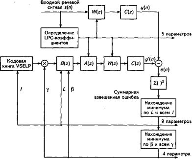 Процедура «анализ через синтез» используется для поиска наилучшего кодового слова (вектора), характеризующего сигнал возбуждения для каждого 20-мс сегмента. Такое кодовое слово находится путем применения каждого кодового слова из словаря для возбуждения CELP -синтезатора. Затем синтезированный РС сравнивается с входным сигналом и вычисляется их разность. Разностный сигнал взвешивается спектральным взвешивающим фильтром с характеристикой W(z) и вторичным взвешивающим фильтром C(z). В результате получается сигнал ошибки е(п). Кодовое слово, обеспечивающее наименьшую среднюю мощность сигнала ошибки е(п), выбирается как наиболее точно соответствующее данному сегменту. Характеристики взвешивающего фильтра выбираются таким образом, чтобы обеспечить наилучшее субъективное восприятие синтезируемого РС человеческим ухом. Второй взвешивающий фильтр C(z) контролирует количество ошибок в гармониках речевого сигнала.