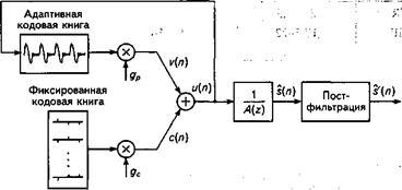 Улучшенноекодирование речи с полной скоростью. В основе такого кодера лежит модель линейного предсказания с кодовым возбуждением(CELP).В этой модели речевой сигнал синтезируется в линейном фильтре синтеза с кратковременным предсказанием (STP) 1/A(z)10-го порядка (рис.13.4). Сигнал u(n) для его возбуждения формируется путем сложения двух векторов возбуждения из адаптивной и фиксированной кодовых книг. LTP -фильтр синтеза реализован с использованием адаптивной кодовой книги. Оптимальный вектор возбуждения ищется в кодовой книге с помощью процедуры «анализ через синтез» - аналогичной той, которая используется в кодировании речи с половинной скоростью.