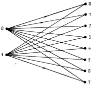 Рис. 15.3. Модель двоичного канала, обеспечивающего мягкие решения при M = 8.