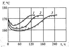 В производственных условиях малых предприятий применяют в основном фритюрницы периодического действия. На рисунке 1 показана динамика понижения температуры фритюра после закладки продукта и восстановления температуры жарки. Из графиков видно, что чем выше соотношение жира и продукта, тем меньше времени затрачивается на восстановление начальной температуры.