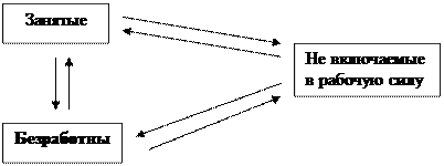 Показатели количества занятых и безработных, численности рабочей силы и численности не включаемых в рабочую силу являются показателями потоков. Между категориями «занятых», «безработных» и «не включаемых в рабочую силу» постоянно происходят перемещения (рис.3.1.). Часть занятых теряет место работы, превращаясь в безработных. Некоторая доля безработных находит работу, становясь занятыми. Часть занятых увольняется с работы и покидает общественный сектор экономики (например, выходя на пенсию или становясь домохозяйкой), а часть безработных, отчаявшись, прекращает поиски работы, что увеличивает численность не включаемых в рабочую силу. При этом часть людей, не занятых в общественном производстве, начинает активный поиск работы (неработающие женщины; закончившие высшие учебные заведения студенты; одумавшиеся бродяги). Как правило, в условиях стабильной экономики, количество людей, теряющих работу, равно числу людей, активно ее ищущих.