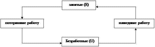 Для расчета естественного уровня безработицы может быть использована динамическая модель устойчивого уровня безработицы («модель динамики рабочей силы»), предложенная М. Фридманом, который исходил из того, что основной причиной безработицы является несовершенство информации. Часть занятых теряет работу, становясь безработными, а часть безработных трудоустраиваются и становятся занятыми. Эти перемещения (потоки) изображены на рис.3.3.
