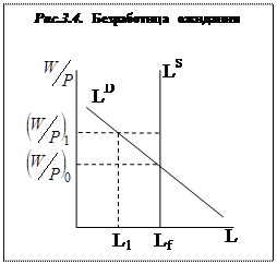 При ставке заработной платы (W/P)0 (рис.3.4.) рынок труда находится в равновесии на уровне полной занятости рабочей силы (Lf). Однако если ставка заработной платы будет установлена на уровне(W/P)1, то предложение труда L1 превысит спрос на труд, и нанято будет только количество рабочих, равное L1. Разница между L1 и L2 составит безработицу ожидания, которая может исчезнуть только тогда, когда ставка заработной платы будет cнова равна равновесной (W/P)0.