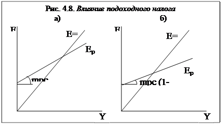 На рис.9.8. (а) представлена кривая совокупных планируемых расходов при отсутствии ставки подоходного налога, а на рис.4.8(б) – при ее наличии.