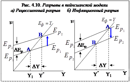 Точка А соответствует равновесию товарного рынка, т. е. ситуации, при которой плани-руемые расходы равны фактическим, расходы равны доходу, а инъекции равны изъятиям. Уровень Y1 представляет собой равновесную величину совокупного дохода (выпуска). Однако эта равновесная величина Y может не соответствовать и, по мнению кейнсианцев, обычно находится ниже уровня ВВП полной занятости, т.е. потенциального ВВП (Y*).