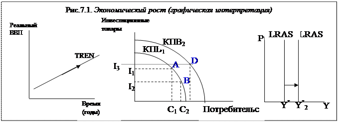 На рис.7.1.(а) кривая (тренд) отражает долгосрочную тенденцию увеличения реального ВВП. На рис.7.1.(б) экономический рост показан с помощью кривой производственных возможностей.