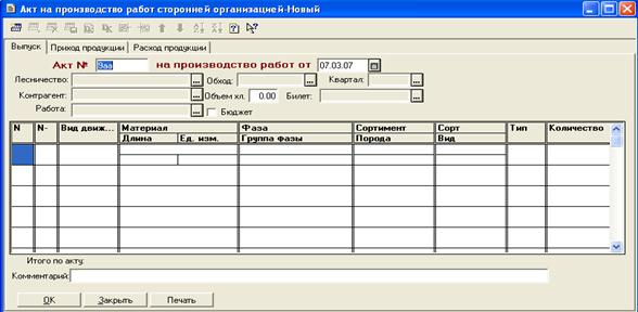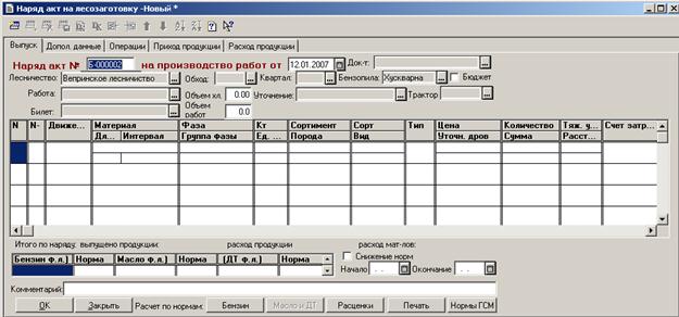Для учета заготовленной продукции в нарядах на лесозаготовку и актах сторонней заготовки выбирается номер лесорубочного билета, при этом проверяется на соответствие наименование лесничества, обхода, квартала, вида рубки, а также виды заготавливаемой продукции и ее количество. При проведении наряда с выбранным лесорубочным билетом уменьшается количество заготавливаемой продукции по билету.