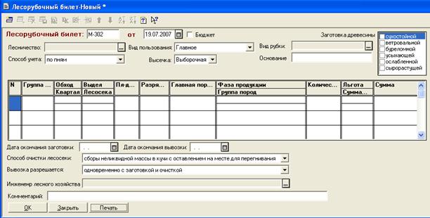 Для документа предусмотрена печатная форма лесорубочного билета, которая вызывается по кнопке «Печать» на форме документа.
