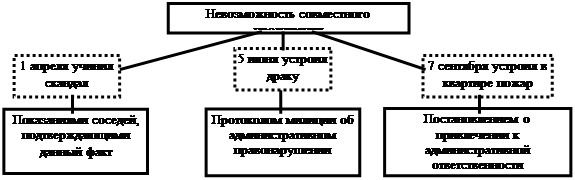 Факт невозможности совместного проживания, который надо установить - искомый факт. На схеме: обозначенное пунктирной линией – доказательственные факты (позволяют сделать вывод о невозможности совместного проживания), а сплошной линией – источники доказательств или средства доказывания.