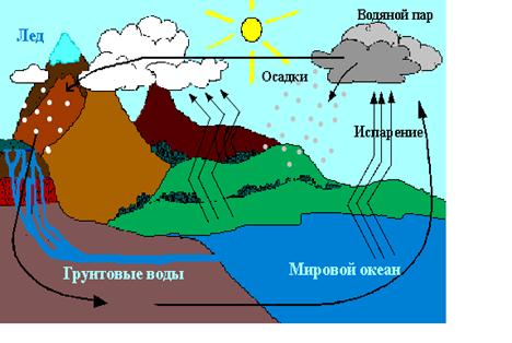 Вода испаряется с поверхности океанов и морей, переносится ветром в виде туч и осадками выпадает на сушу. Часть воды испаряется с суши обратно в атмосферу, другая часть через грунтовые воды даёт начало рекам, третья часть поглощается организмами. По пути сквозь горные породы вода вымывает минеральные вещества; в конце концов они попадают в океан, изменяя с течением времени его состав. На круговорот воды в природе тратится огромная энергия: 10,5 ∙ 1032 Дж в год (10 % всей получаемой Землёй от Солнца энергии).