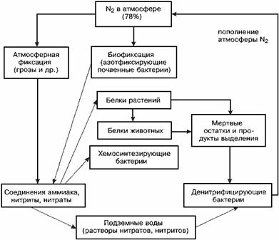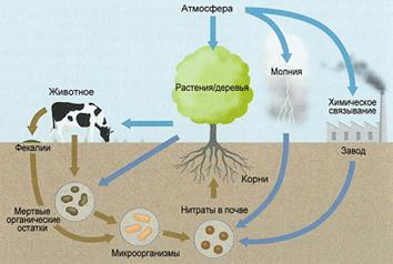 Круговорот азота. Большинство живых организмов не могут усваивать азот в газообразной форме. Исключением являются только некоторые бактерии и сине-зелёные водоросли (при этом некоторые бактерии наоборот восстанавливают нитраты до молекулярного азота). В растениях азотсодержащие соли преобразуются в органические соединения, которые передаются дальше по цепям питания. Обратно в среду соединения азота попадают с мочой или уже после гибели организма.