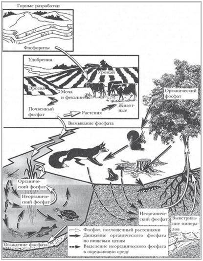 Круговорот фосфора. В отличие от других макроэлементов из круговорота фосфора исключена газообразная форма; в атмосфере он может присутствовать только в виде пыли. В пищевую цепь фосфор поступает в виде фосфатов, преобразуясь в продуцентах в органические вещества. После гибели организма редуценты разлагают органику с выделением фосфатов, замыкая круговорот фосфора. Часть фосфора изымается из круговорота в осадочных породах; обратно этот фосфор возвращается в процессе выветривания.