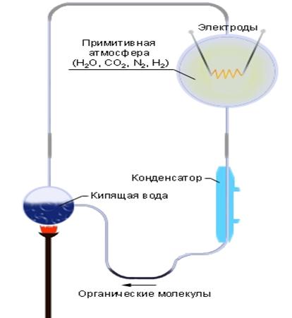 | Рисунок -В опытах Миллера и Опарина из углекислоты, аммиака, метана, водорода и воды в условиях, приближённых к атмосфере молодой Земли, удалось синтезировать аминокислоты, нуклеиновые кислоты и простые сахара |