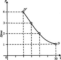 Кривая DD' называется кривой спроса. Она показывает обратную зависимость величины спроса от цены (P – price): с увеличением цены спрос падает, и наоборот.