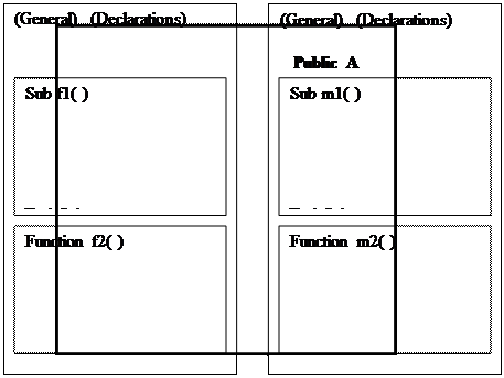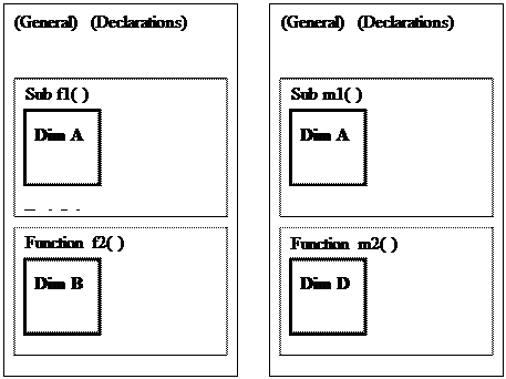 (General) (Declarations) с помощью оператора Dim и доступны только внутри соответствующего контейнера, т.е. формы, модуля или класса.