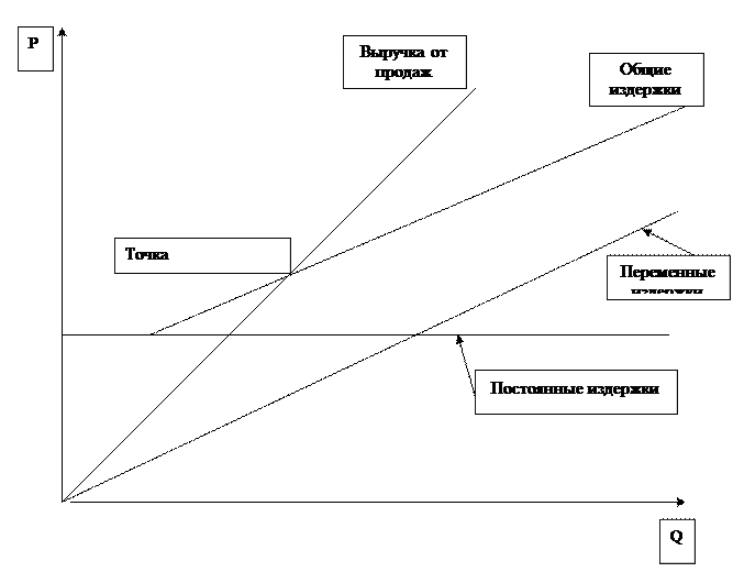 Точка безубыточности — уровень объема производства, деловой активности, продаж, позволяющий достичь состояния равенства совокупных затрат и общей выручки с продаж (рис. 2).