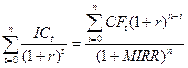 Модифицированная внутренняя норма доходностииначе может быть определена как ставка дисконтирования уравновешивающая приведенную и терминальную стоимость инвестиционного проекта. Левая часть формулы – это дисконтированная по цене капитала величина всех инвестиций; правая часть – наращенная стоимость денежных поступлений при условии, что они могут быть инвестированы по цене капитала (терминальная стоимость)