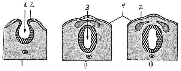 В дальнейшем желобок смыкается в нервную трубку и обособляется от кожной эктодермы. В месте отделения нервной трубки от эктодермы выделяются два тяжа клеток, называемых нервными гребнями (ганглиозные пластинки). Передняя часть нервной трубки начинает утолщаться и превращается в головной мозг.