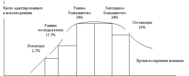 Наиболее сложным является поведение потребителей в отношении товаров-новинок. Процесс восприятия новинки различными категориями потребителей рассмотрен на схеме (рис. 9).
