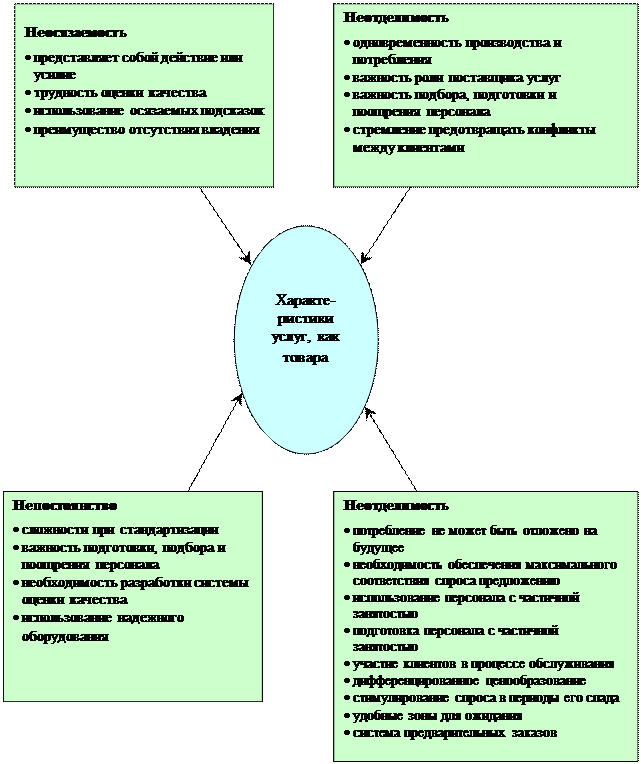 Исследователи и аналитики предлагают множество критериев для определения услуг. В результате было выделено несколько общих для большинства видов услуг характеристик, которые представлены на рис. 3.3.