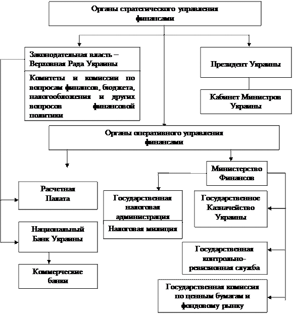 В управлении финансовой системой Украины выделяют органы стратегического и оперативного управления. Общее управление финансами и финансовой системой в соответствии с Конституцией Украины возложено на высшие органы государственной власти – Верховную Раду Украины, Президента, правительство (органы стратегического управления) рис. 2.3.