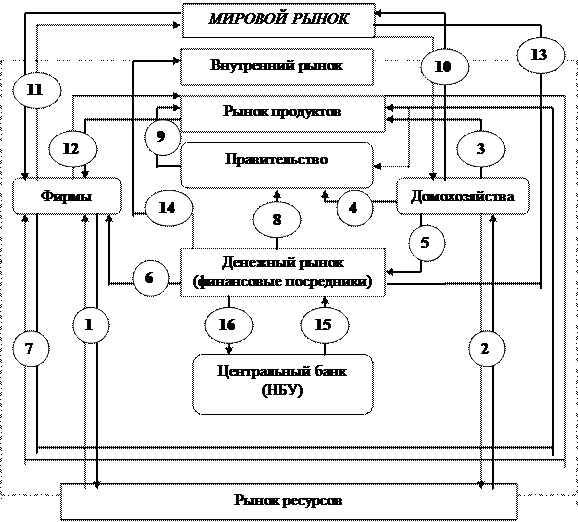 Постоянное взаимодействие денежных потоков уравновешивает не только прилив и отлив денежных средств по чистому импорту и чистому экспорту, но и обеспечивает выравнивание двух ключевых потоков - национального дохода и реализацию национального продукта. Между ними действует внутренняя взаимосвязь, в основе которой лежит единство процесса общественного воспроизводства. В то же время между денежными потоками имеются отличия. Потоки, которые опосредуют движение реальных благ и принадлежат к сектору денежного обращения, обозначены двумя стрелками (потоки – 1, 2, 3, 7, 9, 10, 11, 12). Остальные потоки – 4, 5, 6, 8, 13, 14, 15, 16 – составляют финансово-кредитный сектор, в котором можно указать фискально-бюджетный поток (4) и кредитные потоки (5, 6, 8, 13, 14, 15, 16). В составе этих потоков имеются сугубо финансовые платежи, связанные с приобретением права собственности (акции, иностранная валюта).