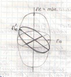 На грани кристалла показаны векторы, в направлении которых происходят колебания световых волн. Длины векторов пропорциональны n для соответствующих направлений. Луч S1, идущий вдоль главной кристаллографической оси L4, пересекает основание призмы так, что ax = ay. Двойное лучепреломление здесь отсутствует. Фигура изображает изменении n для этого сечения (окружность с радиусом r = n0). На вертикальных гранях существует равенство отрезков по ax и ay и неравенство по az. Это неравенство обуславливает анизотропность сечения, следовательно, происходит разложение обычного света на две поляризованные волны, которые колеблются во взаимно перпендикулярных направлениях с разными n. Фигура характеризуется изменением показателя преломления на гранях призмы и представляет собой эллипс с двумя неравными осями. Величина n = ne линейна при изменении его наклона относительно главной оси. Промежуточное обозначение n обозначается ne’.
