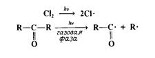 2. Фотохимическое расщепление. Энергия света с длиной волны от 600 до 300 нм составляет от 48 до 96 ккал/моль, что соответствует энергии ковалентных связей. Типичным примером фотохимического расщепления служит образование радикалов из хлора и кетонов: