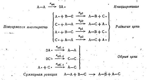 Стадию, на которой генерируется реакционный интермедиат, в данном случае А·, называется инициированием. Эта стадия протекает при высокой температуре, под действием УФ или пероксидов, в неполярных растворителях. В следующих четырех уравнениях данного примера повторяется последовательность двух реакций; они представляют фазу развития цепи. Цепные реакции характеризуются длиной цепи, которая соответствует числу стадий развития, приходящихся на одну стадию инициирования. Вторая стадия протекает одновременным синтезом соединения и образования нового радикала, который продолжает цепь превращений. Последней стадией является стадией обрыва цепи, которая включает любую реакцию, в которой разрушается один из реакционных интермедиатов, необходимых для развития цепи. Чем больше стадий обрыва цепи, тем меньшей становится длина цепи.