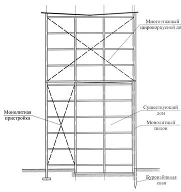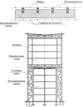 надстройка над существующими зданиями 2-4-х этажей, опирающихся на автономные опоры, в которых размещаются лифты, лестницы, санузлы, коммуникации, инженерное оборудование и т. п.;