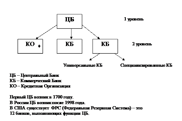 В зависимости от соподчиненности кредитных институтов согласно банковскому законодательству и иерархической структуры кредитной системы можно выделить 2 основных типа построения банковской системы:1. Одноуровневая система: