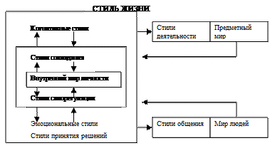 Данная схема может быть проинтерпретирована следующим образом. Каждый человек имеет дело с тремя мирами: миром предметов, в который для простоты суждения придется отнести также мир природы, миром людей и собственным внутренним миром. Взаимодействие с объектами в каждом из этих миров приводит к формированию устойчивых приемов и способов поведения разной степени обобщенности. Наиболее просто соотносятся стили деятельности с предметным миром и стили общения с миром людей. Что касается когнитивных, эмоциональных и стилей принятия решения, то они включены во внешний контур регулирования отношений между внутренним и внешним мирами. Они являются неспецифическими и универсальными, поскольку обеспечивают получение информации из среды и подготовку ответных реакций. Но внутренний мир также требует отражения и воздействия на него стороны личности. Поэтому данные стили имеют двустороннюю направленность извне и внутрь личности. Помимо этого на работу с внутренним миром направлены еще две группы стилей: стили саморегуляции и стили совладания, главная функция которых состоит в поддержании равновесного состояния во внутреннем контуре регулирования личности. Для того чтобы представить стиль жизни человека этой картине надо придать третье измерение – перспективу, поскольку его анализ требует другого временного масштаба. Стиль жизни является интегральной характеристикой взаимодействия личности со средой и с собственным внутренним миром, показывающей как расставлены акценты в соотношении трех видов направленности личности. Также можно выделить партнерский и непартнерский стили общения (таблица 8.).