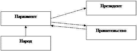 Парламентская республика предусматривает приоритетную роль парламента в конституционном – правовом отношении. Парламент, опираясь на партийное большинство, формирует правительство, может отправить его в отставку. Доверие парламента – обязательная предпосылка для деятельности правительства. Правительство несет ответственность только перед парламентом. Глава правительства назначается парламентом (как правило, лидер победившей партии). Существует двойственность исполнительной власти: наряду с правительством, постом премьер-министра сохраняется пост главы государства – президента или монарха. Президент в парламентской республике избирается парламентом, а не всенародно; его называют «слабый», т.е. он царствует, но не правит. Для сдерживания власти парламента конституцией предусматривается право на его роспуск со стороны главы государства (президента или монарха). Взаимодействие органов власти в парламентской республике показано на рисунке 1.